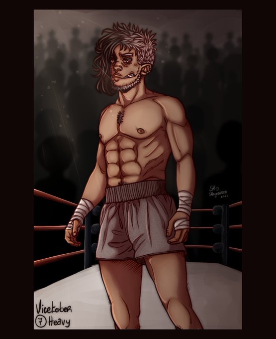 Day 7: Heavy When he was a little younger, Ollie participated in fights, as much for fun as for money. Later, and once he was in good hands, he began to compete, and ended the street fights. He was a competitor in the heavyweight category. #DigitalArtist #inktober2022