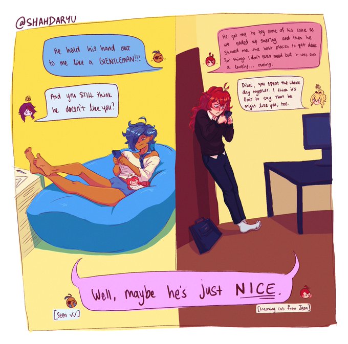 it's v belated but these were my v day pieces for the #LuckaeValentinesExchange2022 for @/doveluc!! just domestic supernatural beings being menaces to each other 😌💖 #luckae #ディルガイ