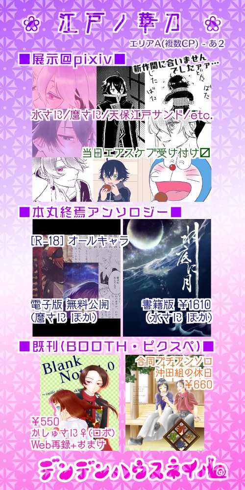 #江戸ノ華刀_参加表明Area #江戸ノ華刀_お品書きArea ギリギリですみません、本日のお品書きとサークルカットです! 既刊が雑多なため複数CPエリアにスペースいただきました。新作下ろせませんでしたが同じ沼の方とお話できればと思っております。よろしくお願いします🙇