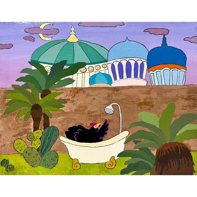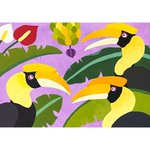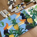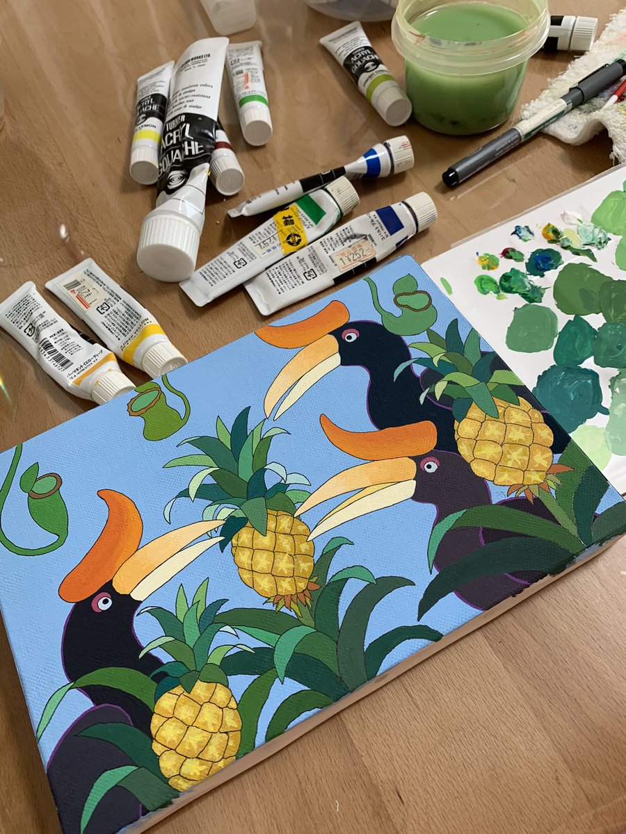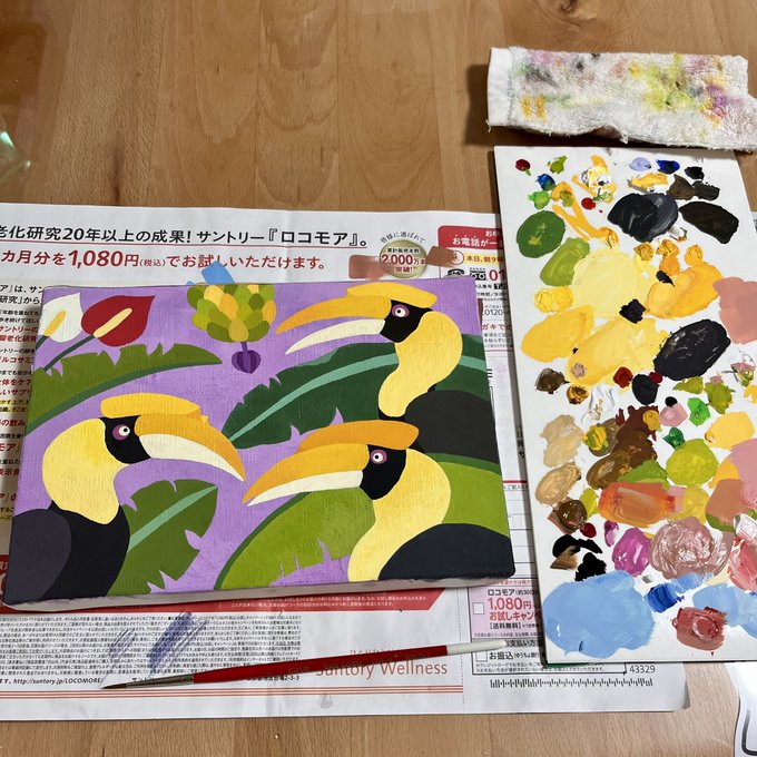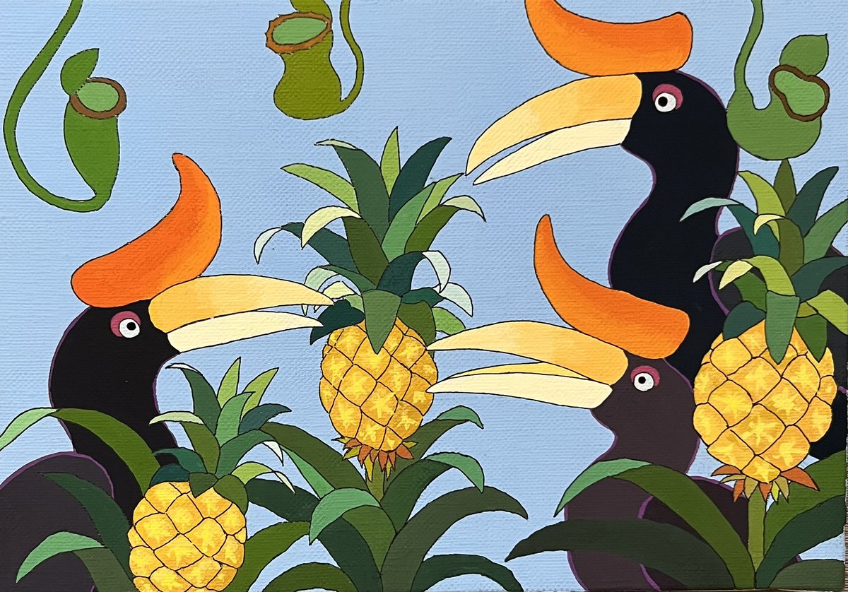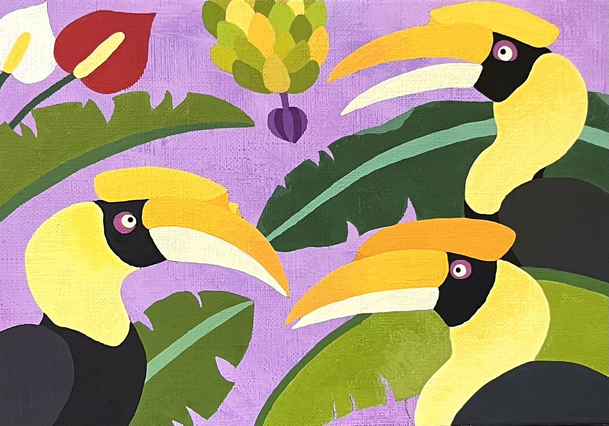 オオサイチョウとバナナ🍌 パープルバージョンを描いています🎨 キャンバスにアクリルガッシュです。 #絵描きさんと繫がりたい #アナログ絵 #アナログ絵描きさんと繋がりたい #イラスト好きな人と繋がりたい #イラスト #art #illustration