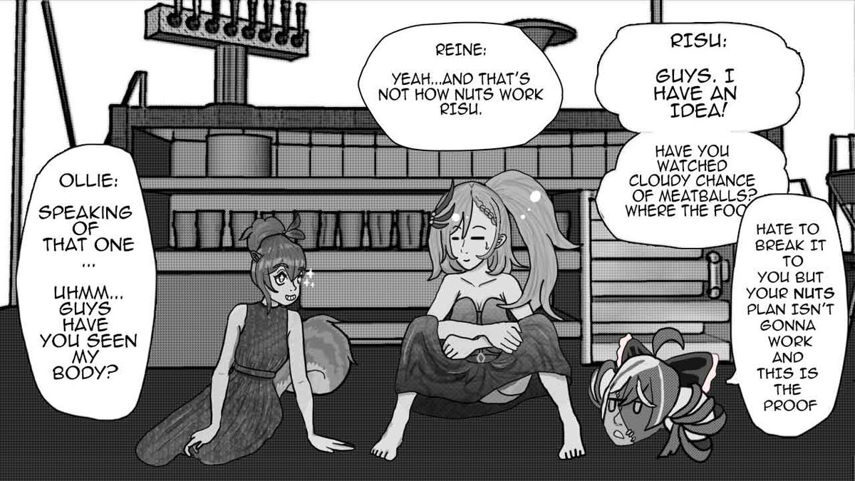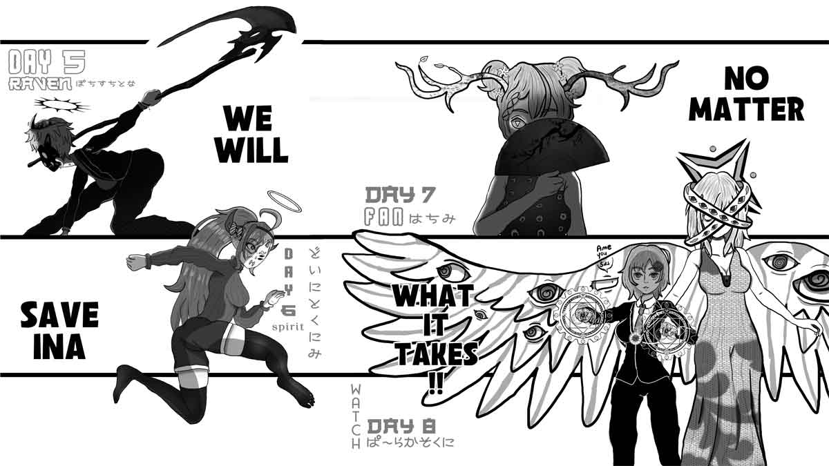 Inktober Day 4: [KNOT} there are 2 kinds of knots. [1/2] In the background bae, Shion and other heavy hitters in the hololive fight against a Possessed Ina. #GambaRisu #inART #Reinessance #illustrayBAE #graveyART #inktober2021
