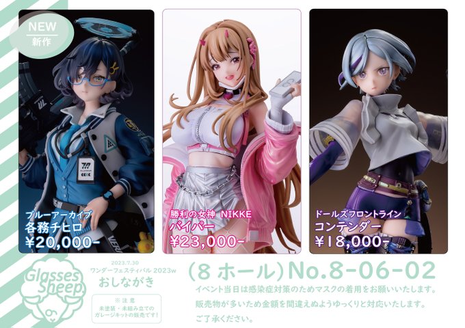 7月30日に幕張メッセで開催のワンダーフェスティバルに参加いたします!8-06-02 Glasses Sheep. 販売するガレージキットのお品書きになります。 〇 各務チヒロ / ¥20,000- 〇 バイパー / ¥23,000- 〇 コンテンダー / ¥18,000- よろしくお願いいたします! #WF2023S #WF2023Sおしながき