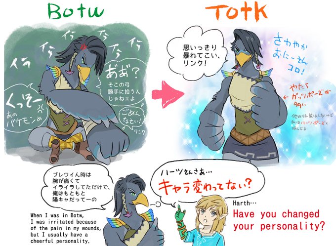 1枚目 テバがハヤブサの弓を持ってるのは、ティアキン前に描いたから 2枚目 ティアキンで出番のなかったリーバルが、同じ境遇のカッシーワに懐いてる 4枚目 村の異変解決後に記念撮影 4 pieces of the first half of this year that I choose #2023年自分が選ぶ今年上半期の4枚#Teba#Tulin#Kass