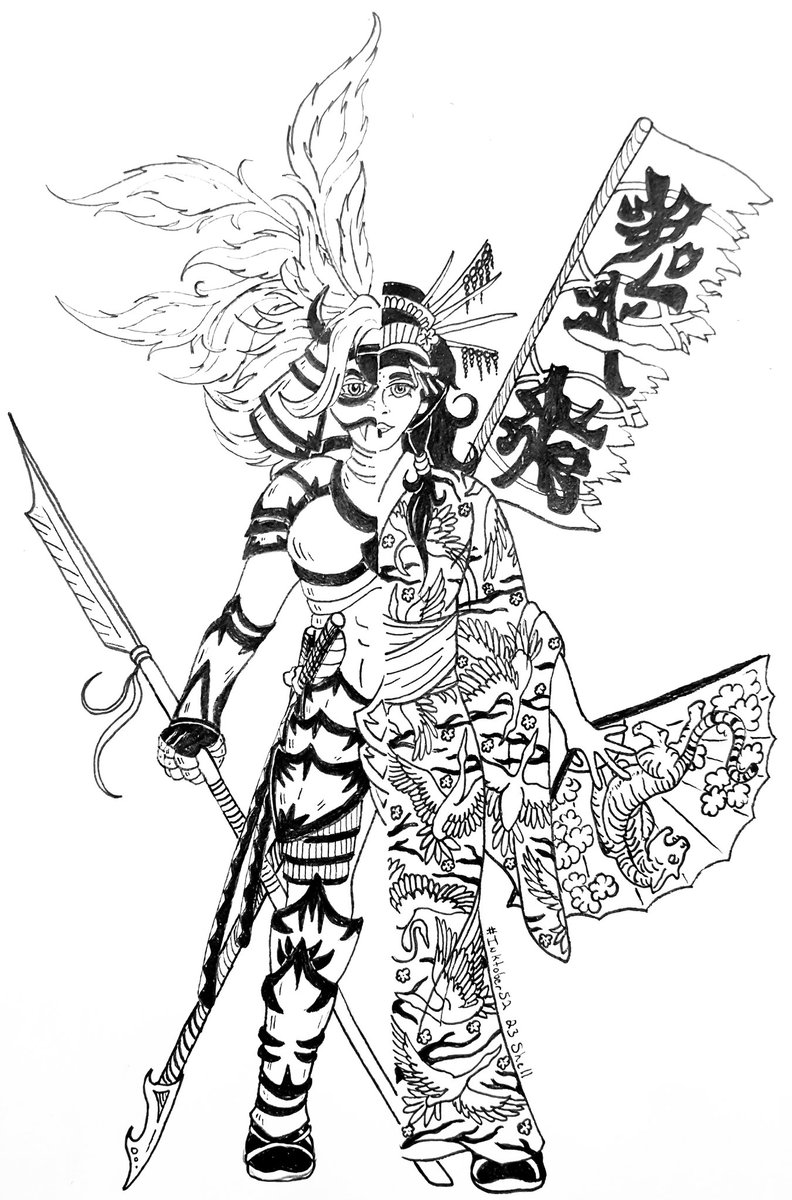 #Inktober52 22 is #Shell represented by #Yoshitsune my Shogun Warriors character defined by her "Eye of Tiger" and "Wing of Crane" personas, weapons of choice - naginata, dai sho, fan . #artistontwitter #oc #redraw #inktober #samurai #geisha #minamoto #sengoku #shogunwars
