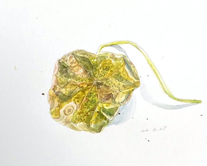 0 11 ナスタチウムが枯れたよ〜 写真に撮ったらコントラストが強くなってしまって、葉っぱの模様が目玉に見えて怖い… #水彩画 22/06/27 18:56