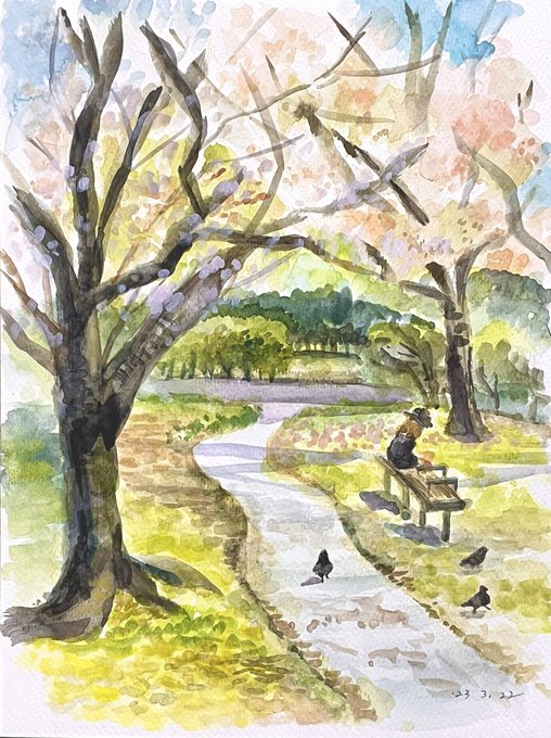 2 25 春のスケッチ 山桜が見頃です。 #水彩 23/03/22 18:49