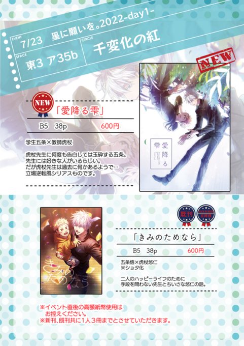 27 175 7月23日お品書きです! 新刊はかなり持っていくので大丈夫なはず…当日はどうぞよろしくお願いします!🌸 ※売り子さんのお一人が体調面の関係で、座って対応させていただく場合があります。あらかじめご了承ください。 22/07/22 00:35