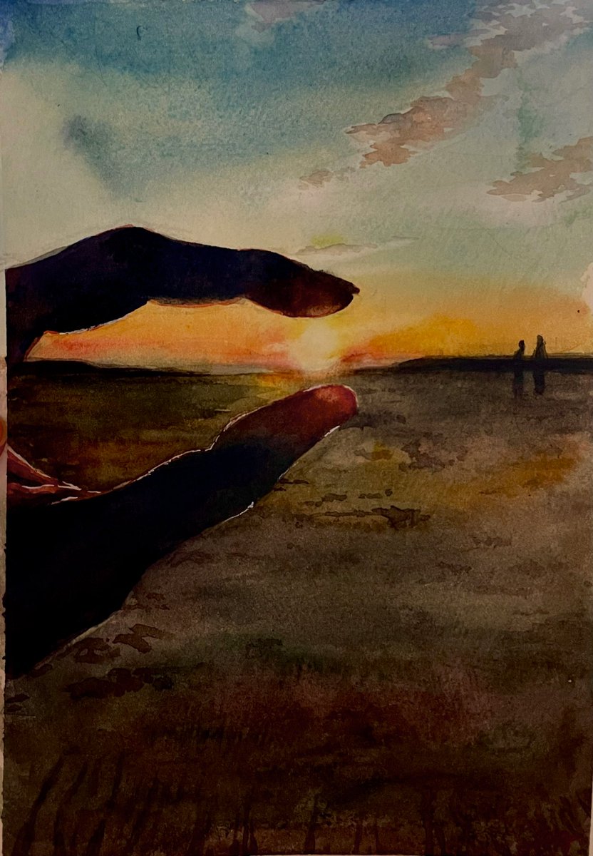 「太陽をつまむ@鳥の海」ランプライトsm #透明水彩愛好会 #水彩画 #夕焼けの絵 mouenさんのように遠くの人シルエットをうまく描けません😄💦