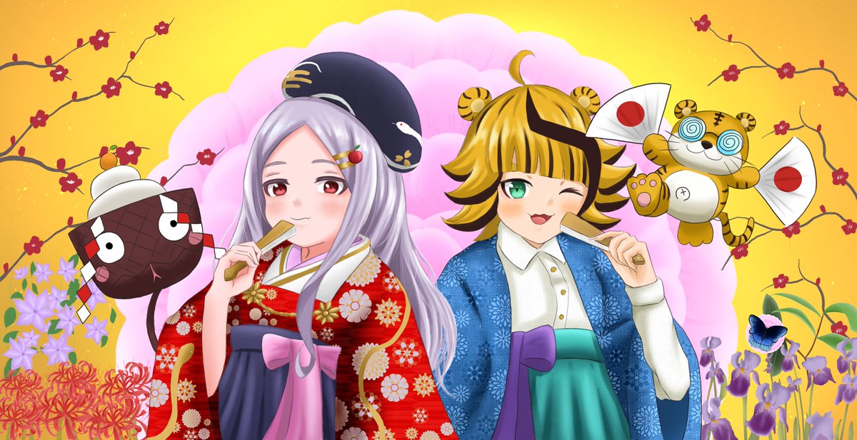 遅くなりましたが、正月絵描きました!! うちの子あかりちゃんと今年の干支にちなんでトラ娘です♪ 今年は華やかな年になることを願って、背景に四季折々の華を描きました^ ^ #正月イラスト #蛇園あかり #オリキャラ