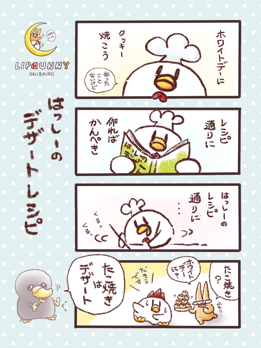 『はっしーのデザートレシピ🧁』 友チョコのお返しにクッキーを焼くニワセン。 はっしーのレシピに間違いはない!はず…? #ホワイトデーイラスト #ホワイトデー #4コマ #4コマ漫画 #漫画が読めるハッシュタグ #みんなで楽しむTwitter展覧会 #リップバニー