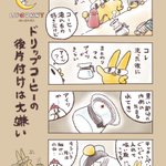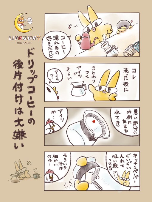 『ドリップコーヒーの後片付けは大嫌い』 コーヒータイムが大好きなリプバたち☕️ だけど、ドリップしたコーヒーを受ける容器(コーヒーサーバー)を洗うのは、ちょっぴりお好きでない様子… #4コマ #4コマ漫画 #漫画が読めるハッシュタグ #みんなで楽しむTwitter展覧会 #リップバニー