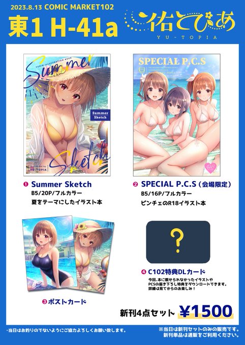 #C102 #C102お品書き 夏コミのお品書きです! 今回は新刊セットのみの頒布となります。 新刊単品は通販でよろしくお願い致します! 2日目の東H-41a「佑とぴあ」でお待ちしております🙏 🍈通販↓ melonbooks.co.jp/detail/detail.… webカタログ↓ webcatalog.circle.ms/Perma/Circle/1…