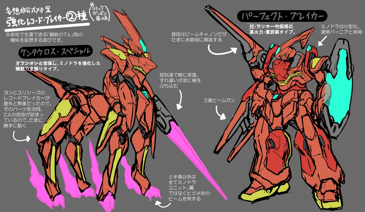 ▼本日のラクガキ 以前、趣味で『鋼鉄の7人・全員生還バージョン』と称して、ディキトゥスにも勝てる強化版MSを描いてましたが 「そういえばドレックのことを完全に忘れてた…」 という痛恨のミスに気づき、慌ててレコードブレイカーの強化案を2つほど描きました。なぜかコミックボンボン風? twitter.com/shibuya_rain14…