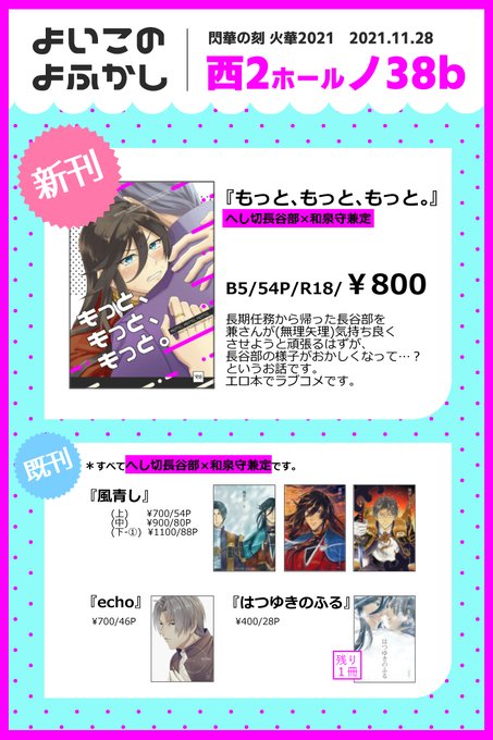 11/28閃華の刻火華2021のお品書きです! よろしくお願いします🙇♀️ ■西2ホール ノ38b 【よいこのよふかし】 ■新刊サンプル pixiv.net/artworks/94111… ✨通販はこちら✨ ・BOOTH(匿名配送) yoico.booth.pm/items/3451321 ・とらのあな ec.toranoana.jp/joshi_r/ec/ite…