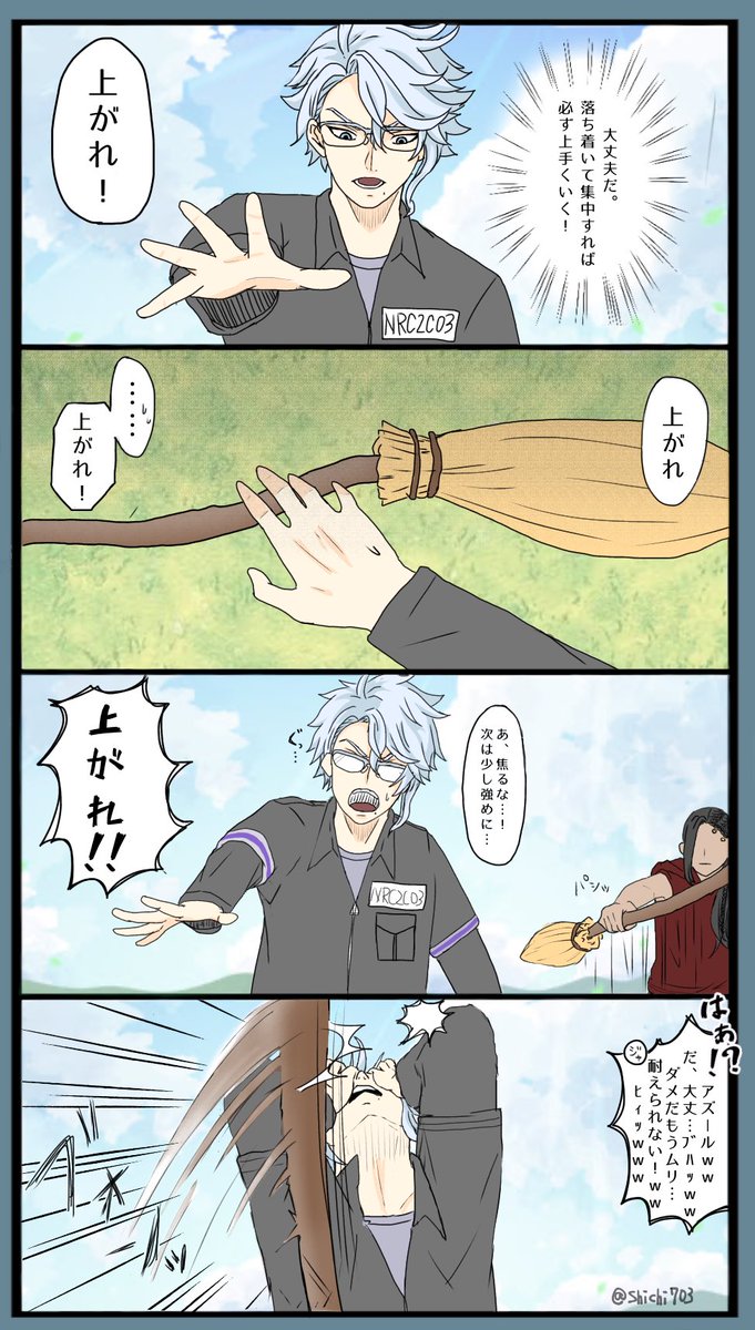 賢者の石の箒バンッのところ観ていたら もしNRCでも「上がれ!」で箒を持つとしたらアズールもあぁなるな、と思ってしまいました🤔🤔 ※ハリポタ風、圧倒的n番煎じ #twstファンアート #ツイステファンアート
