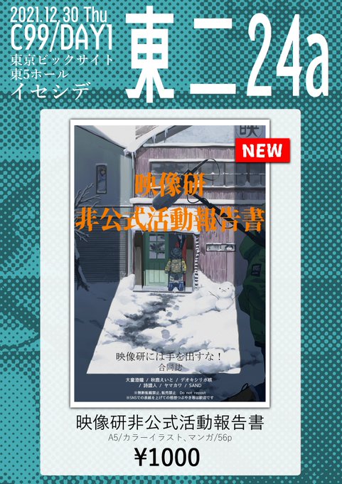 ・コミックマーケット新C99告知 【参加日】12月30日(木) 【配置場所】東地区 ニー24a 【サークル】イセシデ 映像研には手を出すな!合同誌を頒布いたします! 漫画とイラストの本です。 通販も大量に予定しているのでご利用ください。 参加者続く↓ #コミックマーケット99 #C99