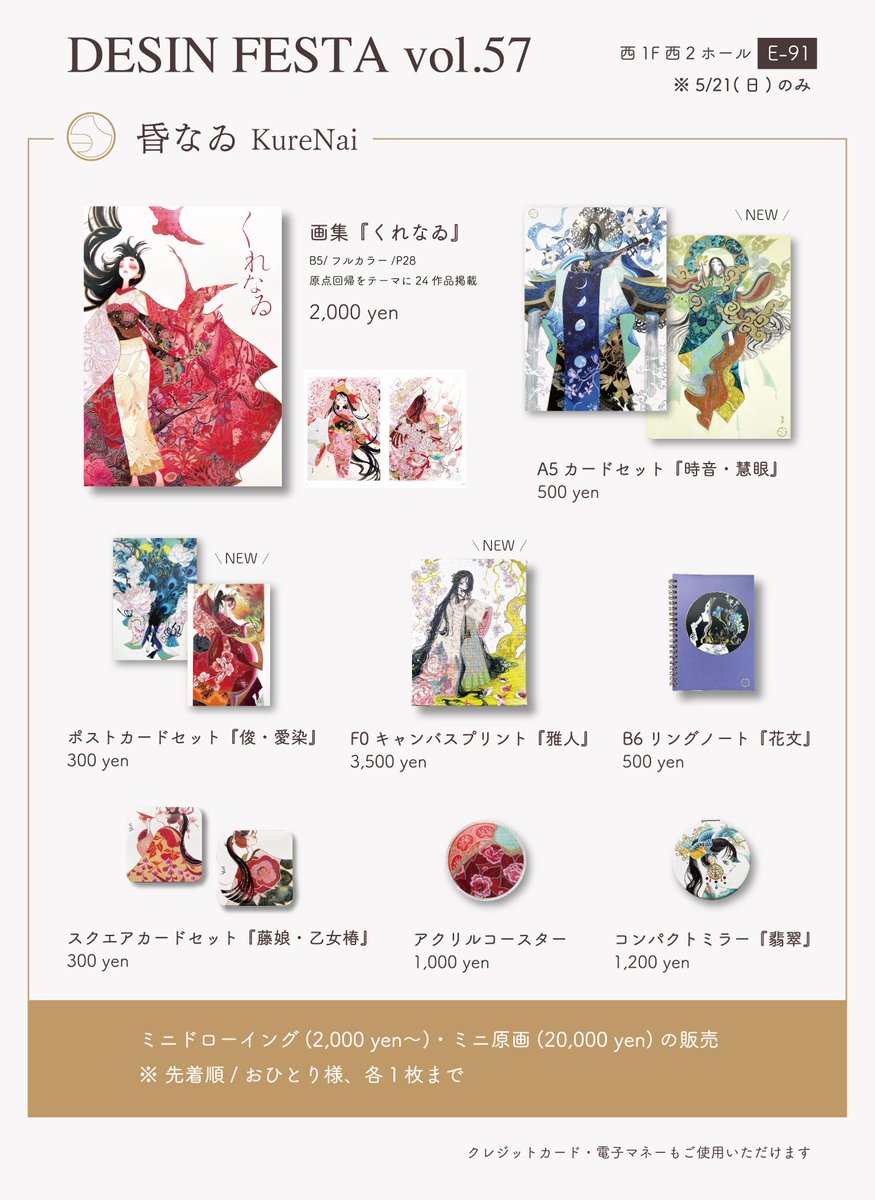 💐デザインフェスタvol.57出展の告知💐 【出展日】5/21(日)11時~(16時撤収予定) 【場 所】東京ビッグサイト西1F西2ホール 【ブース】E-91 【出展名】昏なゐ 会場限定の新作原画・グッズをご用意しました! ぜひ遊びに来てください〜 #デザフェス57