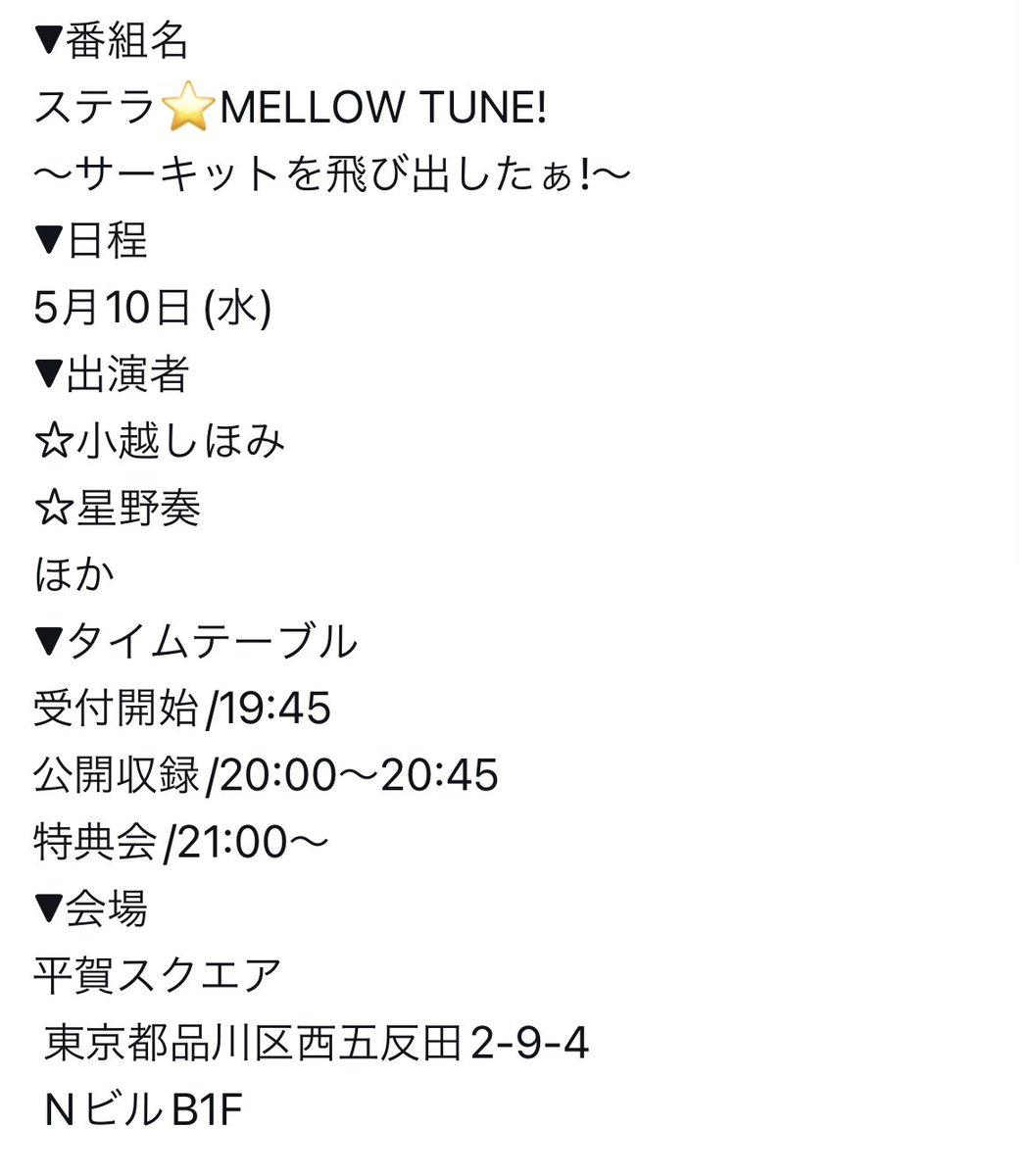 5/10ステチュ公開収録の予約開始しました🫶🏻 今回からふくろうFM放送になって番組名も『ステラMELLOW TUNE』にリニューアルしたよ☺️ (略してステチュは変わらず🙆🏻♀️) しほみん指名で現地観覧&オンライン観覧お待ちしてます❤️🔥 docs.google.com/forms/d/e/1FAI…