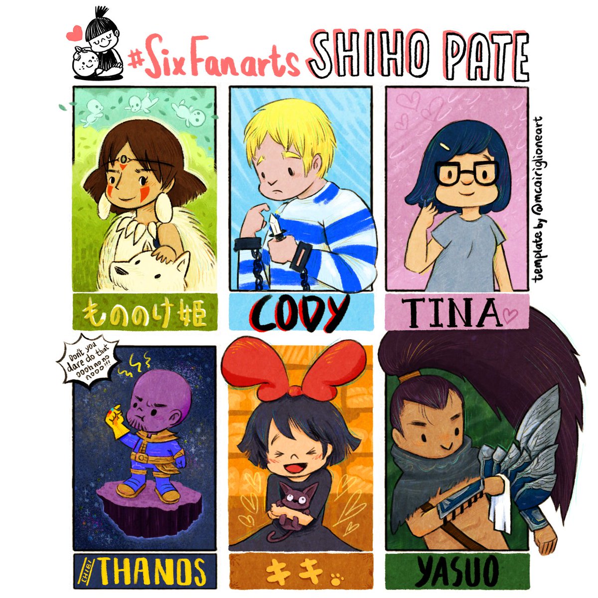Here it is! My #SixFanarts DONE! #princessmononoke #Cody #Tina #Thanos #kiki #yasuo #ghibli #SFIV #BobsBurgers #Marvel #LeagueOfLegends