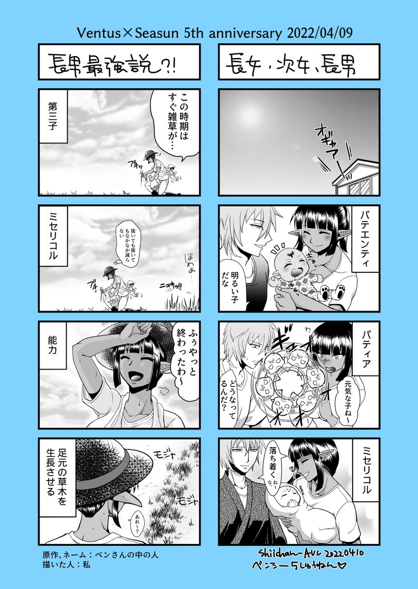 9 39 なんと!うちよそのベンシー5周年です~🥳(昨日だけど間に合わなかったw)えゆしの大型戦で気を遣ってもらったり、応援してくれる方、そしてお相手のベンさんの中の人に感謝を…ありがとうございます。 ベンシーと子供たちのお話をベンさんが考えてくれたので描きました。 22/04/10 23:20
