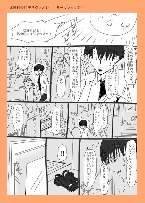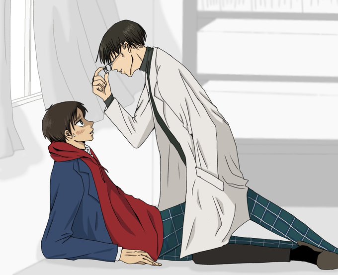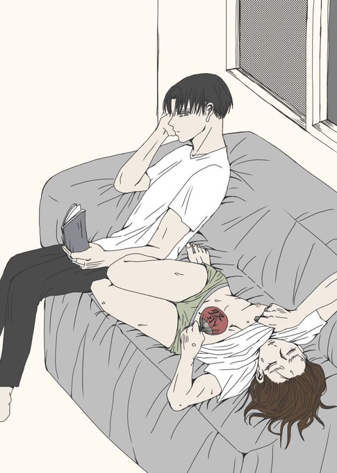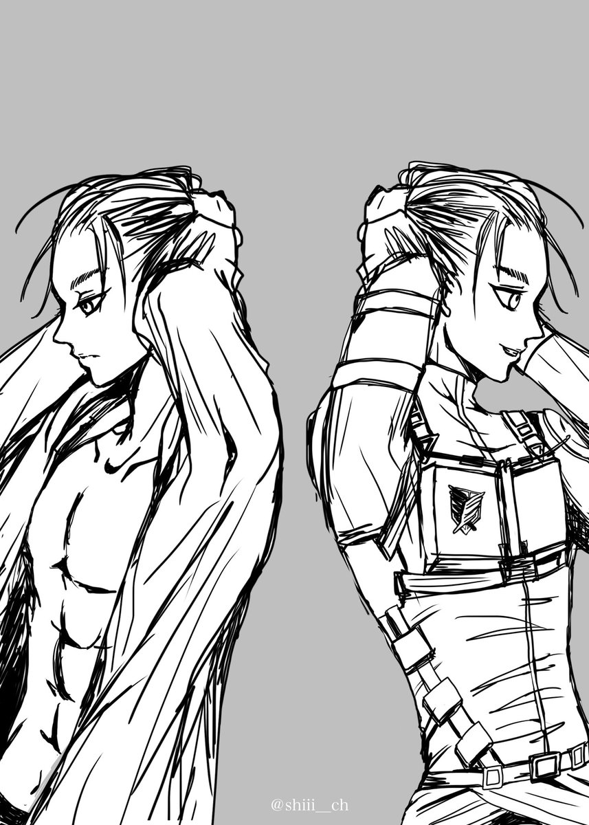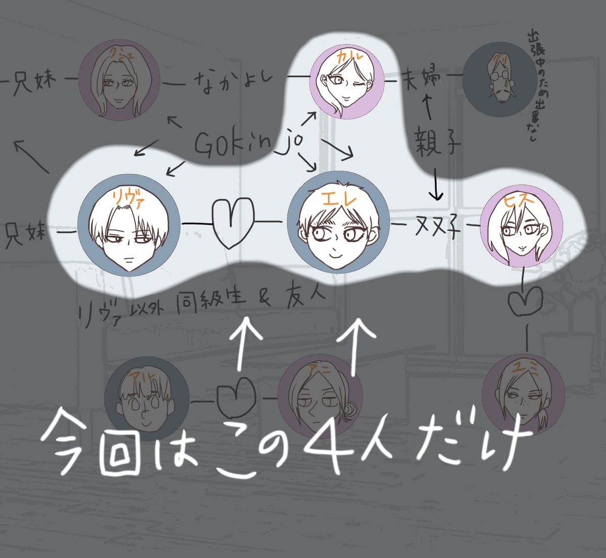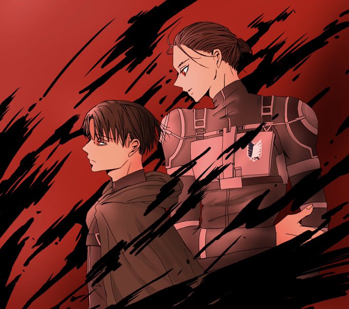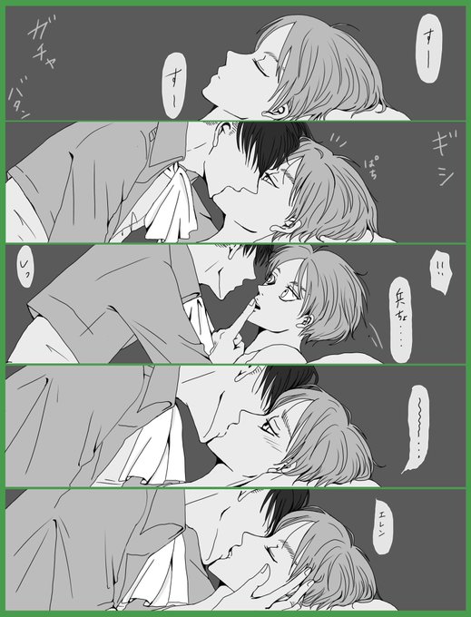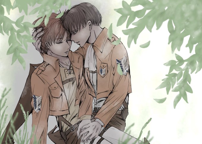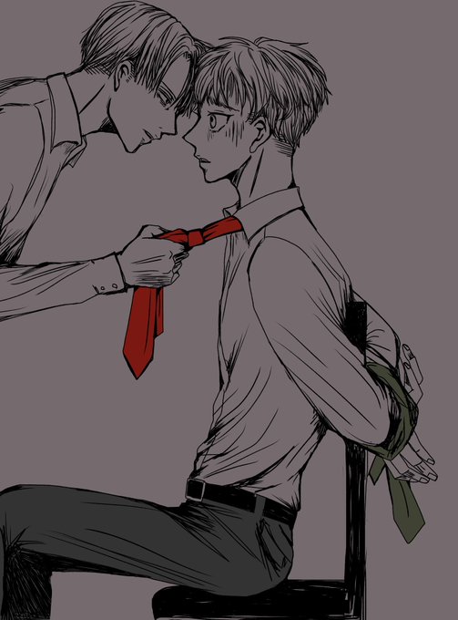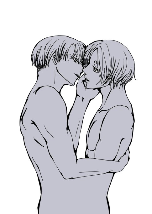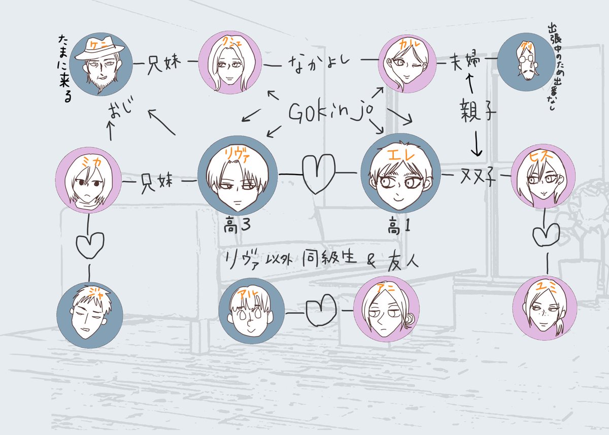 エレヒスが双子設定の妄想が止まりませんでした👭 ※リヴァエレ ※下の相関図に矛盾と抵抗を感じている方は見ないで ※ヒスの半裸に動じない2人を描きたかっただけ poipiku.com/4433147/841423…