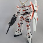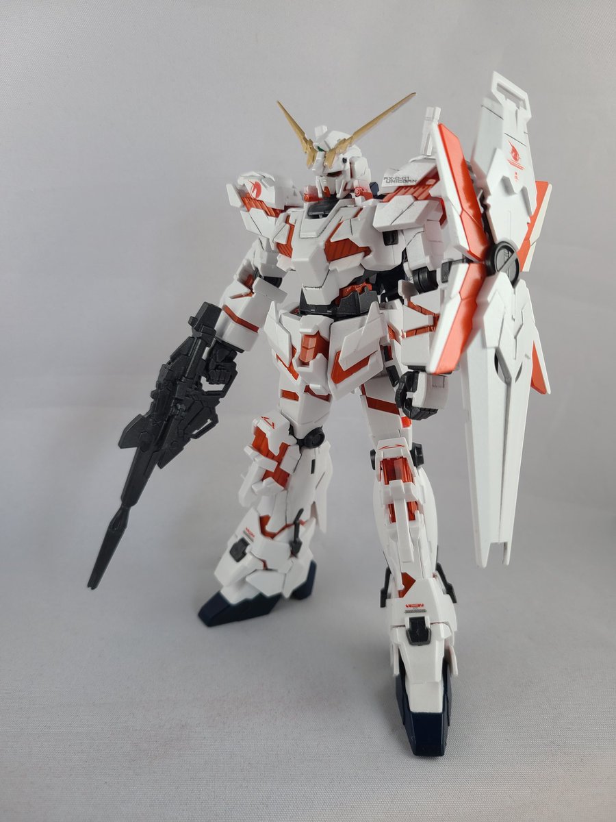 #ガンプラ #ガンプラの画像貼るとRTされると聞いて #ガンプラ好きと繋がりたい RX-0ユニコーンガンダム(DM)完成しました 今回はホワイトパールや蛍光レッド使っている為トップコートは光沢仕上げにしました 角の黄色はクレオスのゴールド、関節やビームマグナムなどは連邦グレーを使いました