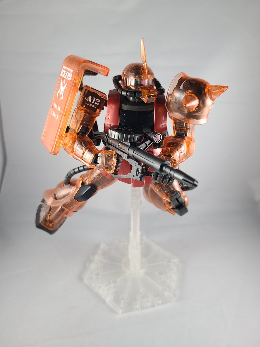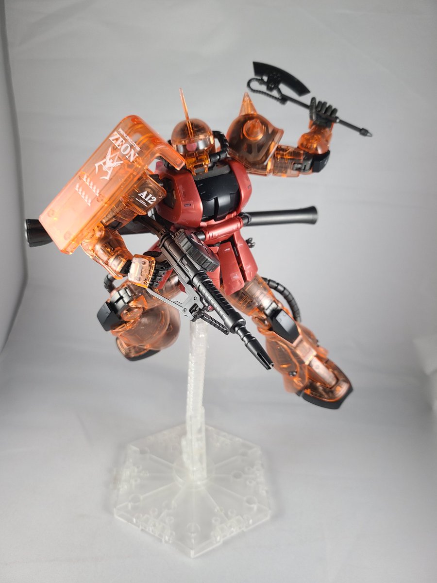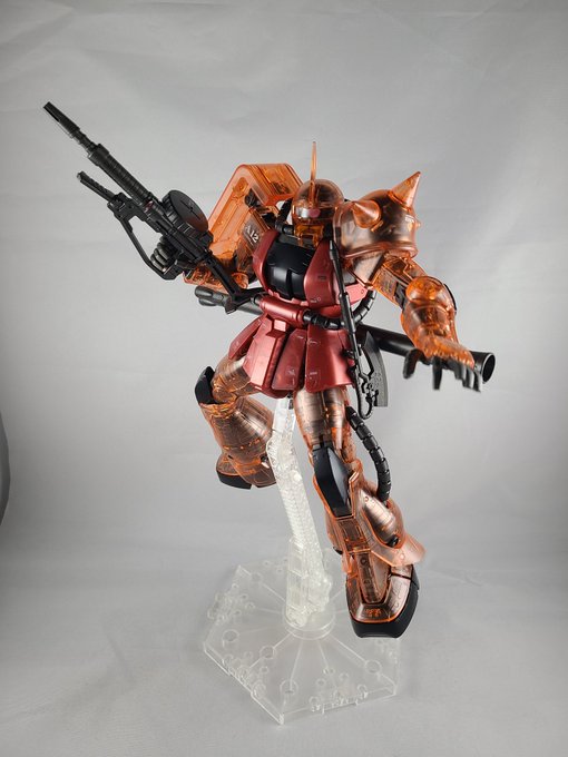 #ガンプラ #ガンプラの画像貼るとRTされると聞いて #ガンプラ好きとつながりたい シャア専用ザク(ソリッドクリア)完成しました 指が可動式なので差し替え無しで様々なポーズが出来るのでより自由にディスプレイが可能です ただ少しでも武器と手の接続甘いとすぐポロリしますね