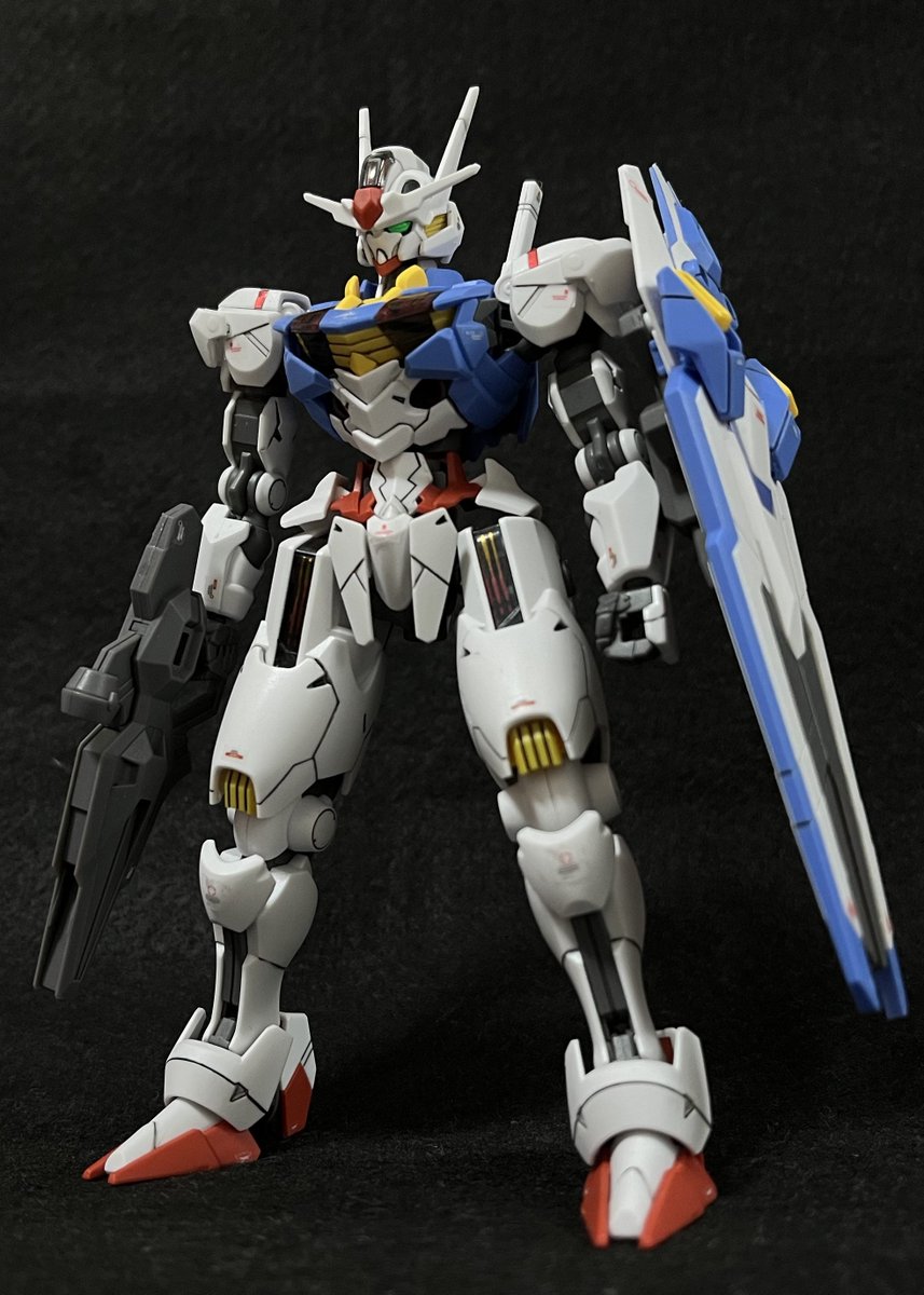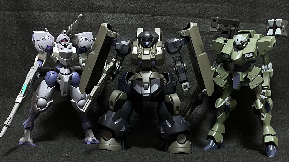 おっはようございます☀️ グループ3社の実戦仕様MS、一気に作りました😊 渋〜いカラーリングが良き🖤 あとは今のところの悪者、シャディクのミカエリス。 これ立たせるの難しいw #今月作ったプラモ晒そうぜ #水星の魔女
