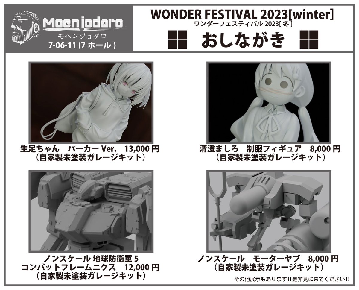 ワンフェスお品書きをもう一度! ・生足ちゃん 13000円 ・清澄ましろ 8000円 ・コンバットフレームニクス 12000円 ・モーターヤブ 8000円 全て自家製のガレージキットです! 相変わらずのごった煮感! モヘンジョダロ 7-06-11でお待ちしてます! #ワンフェス2023冬 #WF2023W