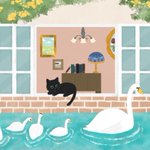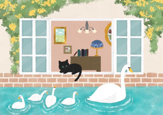 海辺の家 #illustration #art #drawing #cat #swan #イラスト #動物 #猫 #白鳥