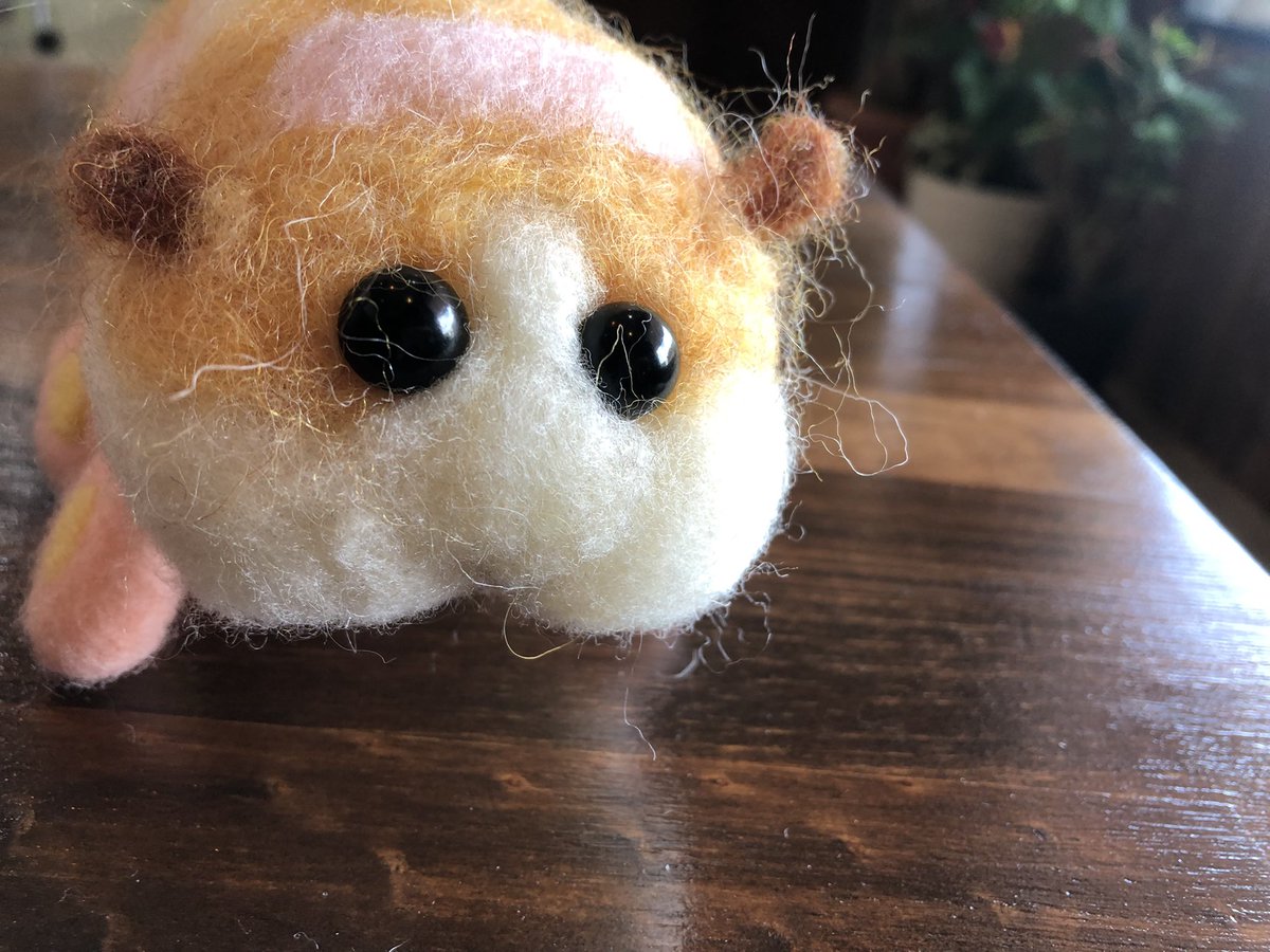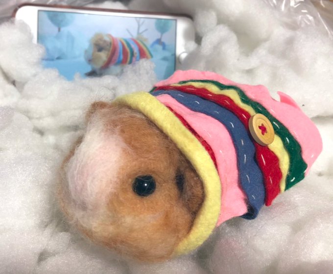 10歳娘が羊毛フェルトでつむぎちゃんを作りました☺️ 防寒ウェア?はフェルトを手縫いでちくちく。。 遠くから見るとぱっと見、本物のモルモットに見えなくもない。。?笑 #モルカー #モルカーファンアート