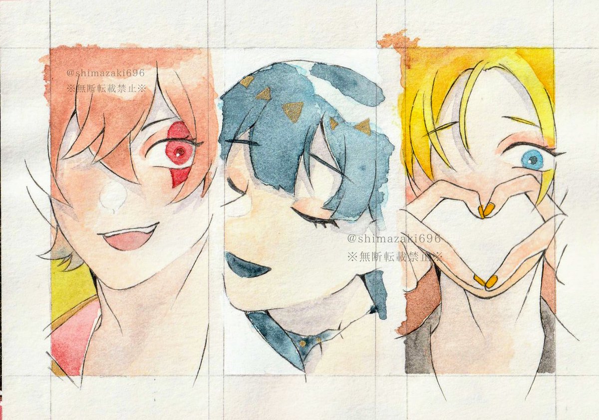 0 6 栞作成で描いたイラスト〜🥳 1枚目:綾部喜八郎、クルーウェル、アズール 2枚目:エース、ラピス、創作 #ツイステファンアート #twstファンアート #宝石の国 #忍たま 21/06/27 16:07