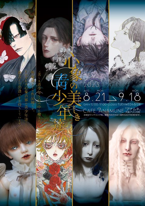 ◻︎展示のお知らせ◻︎ 『心象の美しき青少年達』 ☞ 会期 •8月21日(月) - 9月18日(月) •12時-17時 •定休日: 火水、8月24日(水) ☞会場 cafe Anamune(大阪アメリカ村) anamune.com ワンドリンク制、観覧のみの方は入場料500円 私は新作1点を出展いたします🦋