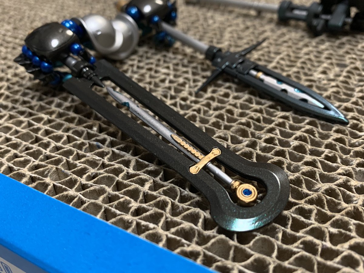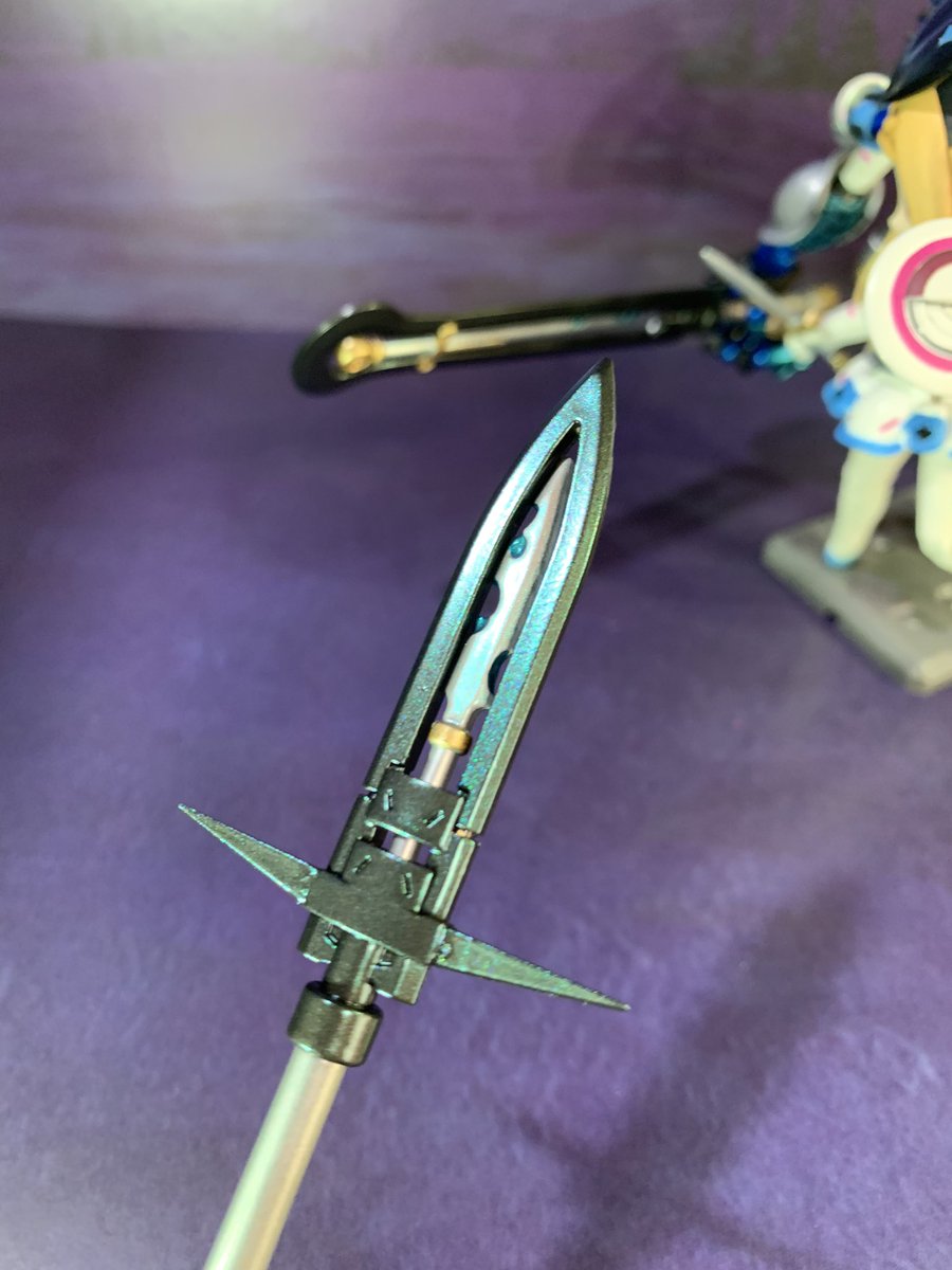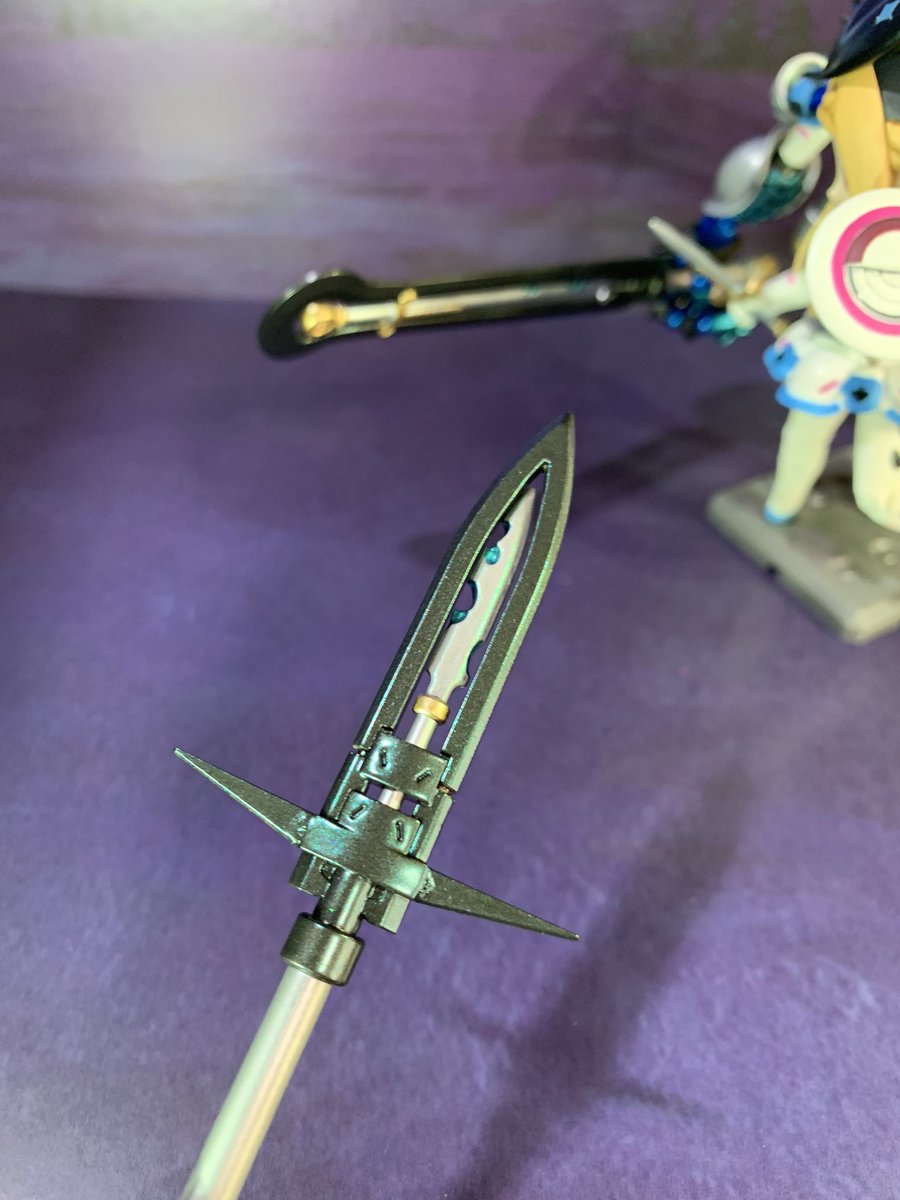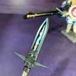 アリッサの武器、元々刃こぼれして欠けたようなモールドがあったんで、 シルバーで塗った上にモールドのトコだけ青竹色で部分塗装、その上からクリスタルカラーターコイズグリーンを全体にぶっかけて魔力的なアレが刀身から溢れ出ているイメージで仕上げました。 #デスクトップアーミー #DTA