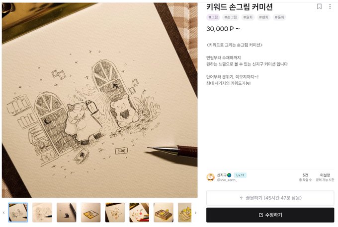 커미션 플랫폼인 크레페에서 원화커미션을 오픈했습니다(쨔쟈쟌)🎉 제 그림으로 보고싶은 키워드를 신청하고 원하신다면 원화로도 받아볼 수 있어요! 연필, 펜화, 색연필, 수채화 등 다양한 타입으로 구성되어 있는 키워드 원화 커미션 어떠신가요? 희희 kre.pe/Mn5V