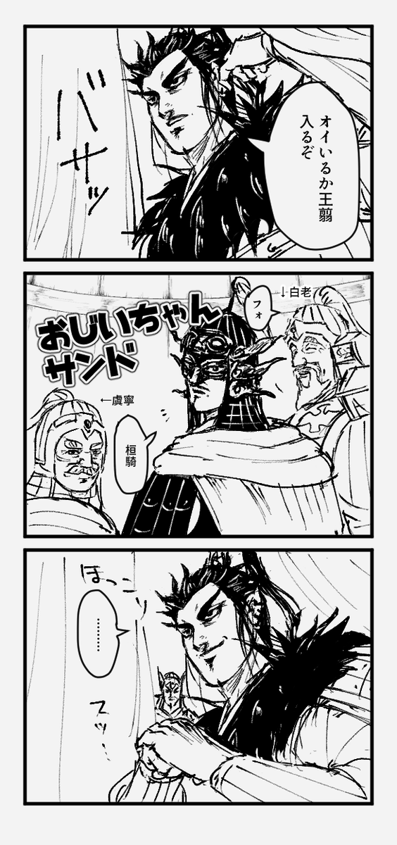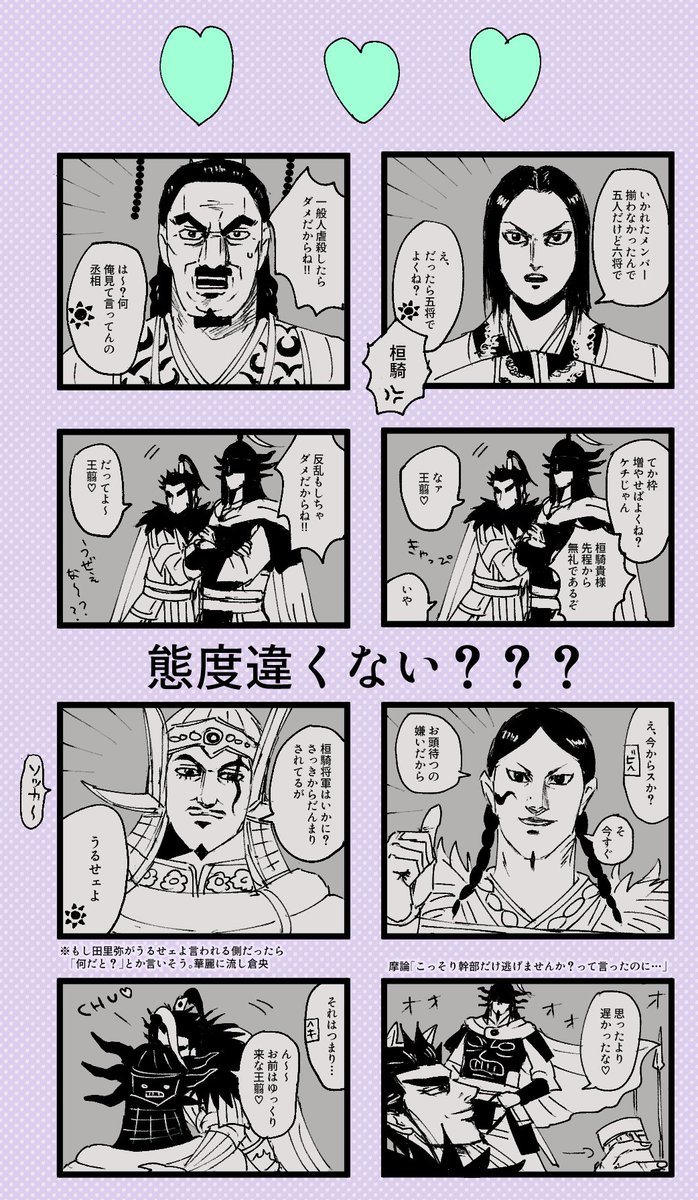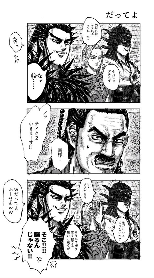 #色んな桓騎が見れるタグ 顔面の変化をふりかえるおかちら達 さっきーずをバックに不敵な笑みを浮かべるおかちら かまんをカンキ刺しするおかちら 魏変装中のおかちら