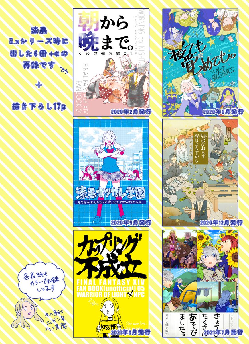 8/27 TM23の新刊です! 「夜はまだまだこれからだ」A5/202p/イベント頒布価格2000円。 漆黒5.xシリーズの時に出したオールキャラ本6冊の再録集です。 ・「朝から晩まで。」pixiv.net/artworks/79243… ・「寝ても覚めても。」 pixiv.net/artworks/82016… サンプル1/3