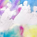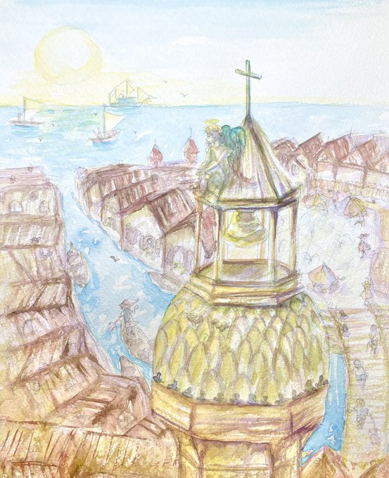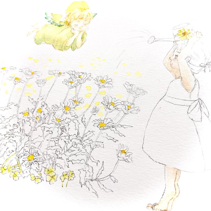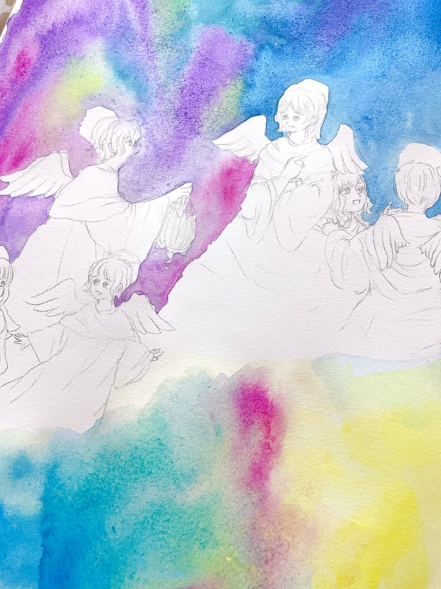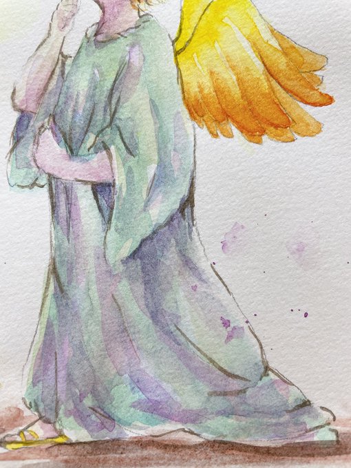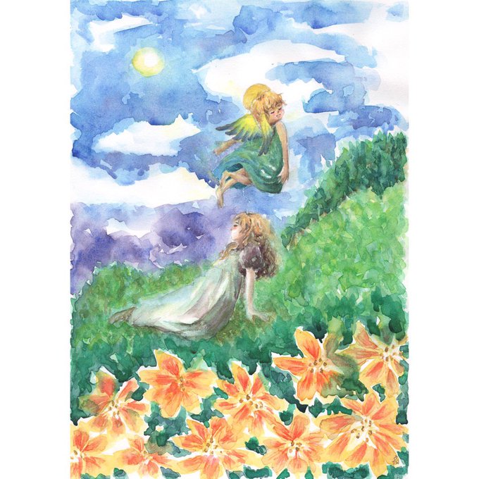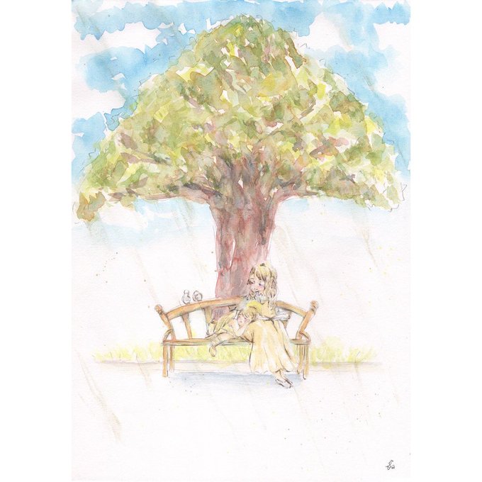 大きな木の下で。 スキャンすると雨が降っているようで、光に当てると日が差しているように見えます。 #イラスト #透明水彩 #ホルベイン #マルマン #お絵描き #illustration #watercolor #マルマンスケ部
