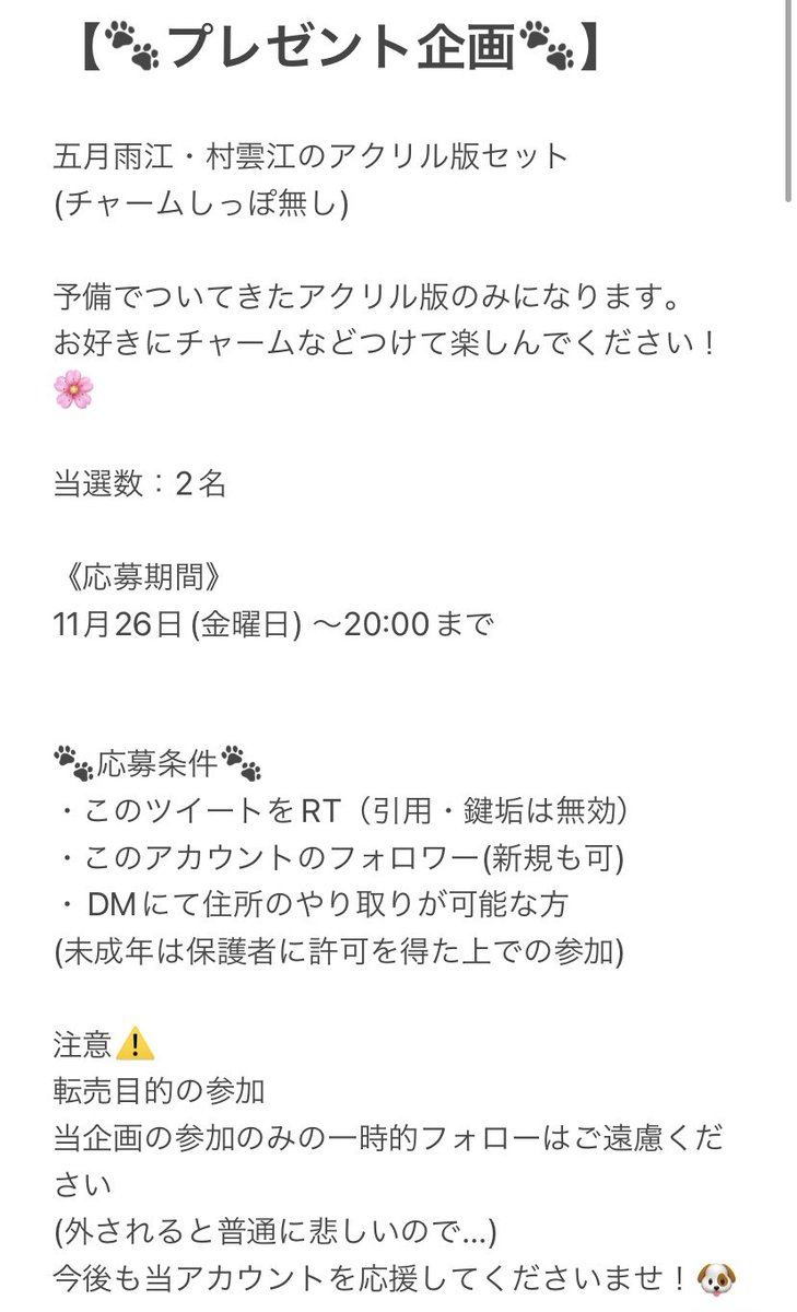 【🐾プレゼント企画🐾】 イベント前プレゼント企画です!! 今月28日に頒布予定の五月雨江・村雲江のアクリル板セットをプレゼントいたします!🐾 《期間》 11月26日(金曜日) ~20:00まで 抽選にはあたれら使用いたします。 参加条件は画像をご覧ください! よろしくお願いいたします twitter.com/shinapple_0424…