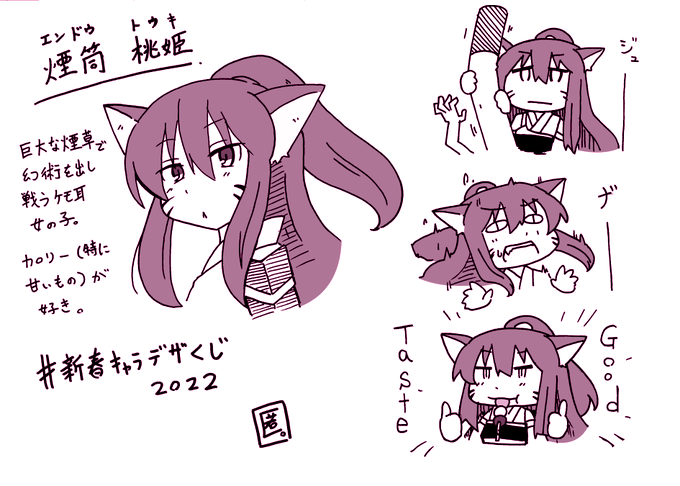 タイガー!今日も気温がサムサムな吉宗です。 キャラくじ、名前を付けている方が多かったので(もちろん強制ではありません)自分のキャラにもつけてあげようと思い追加で描きました。 改めて煙筒桃姫ちゃんを宜しくタイガー! #新春キャラデザくじ2022