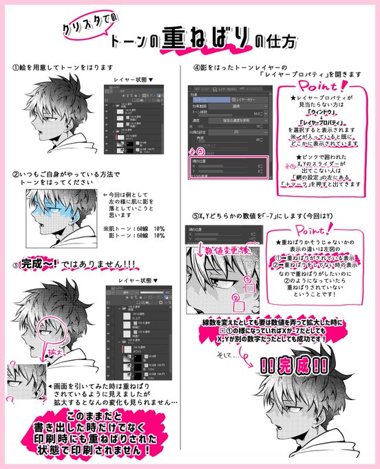 創作仲間から同じ質問たくさん貰うので【クリスタでのトーンの重ねばりの仕方】をまとめました。 ご参考までに! (※ツリーにおまけあるんですが集合体恐怖症の人ご注意を!)