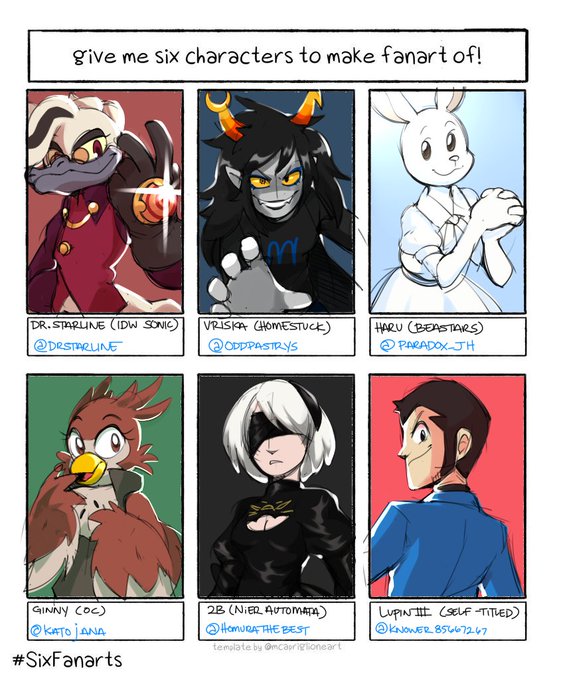 The #SixFanarts are finished! Dr. Starline (IDW Sonic) for @DrStarline Vriska (Homestuck) for @oddpastrys Haru (Beastars) for @Paradox_JH Ginny (OC) for @Katojana 2B (NiER Automata) for @HomuraTheBest and Lupin III (Self-titled) for @Knower85667267 Enjoy~!