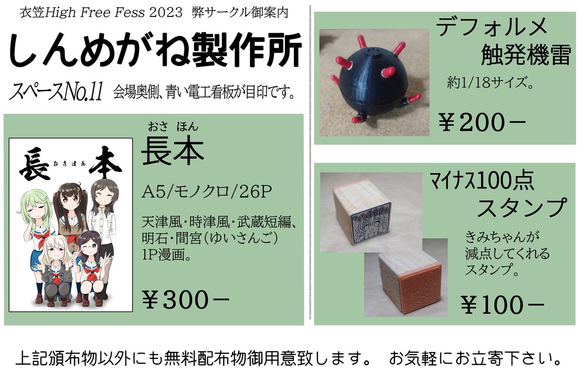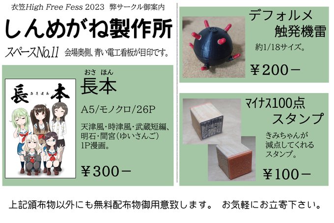 29 40 2月19日(日)に開催されます、衣笠High Free Fess2023にサークル参加致します。御興味御座いましたら是非御立寄下さいませ。 23/02/17 23:49