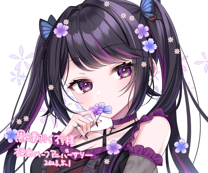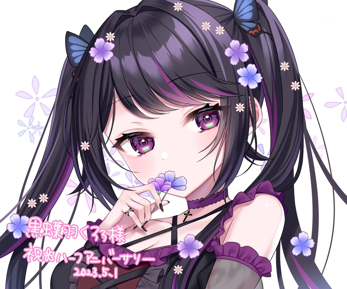 8 27 黒蝶羽くろろ様(@Chloro_xX )のハーフアニバーサリーイラスト描かせていただきました🦋🖤💜 おめでとうございます!🎉✨ 23/05/03 17:08