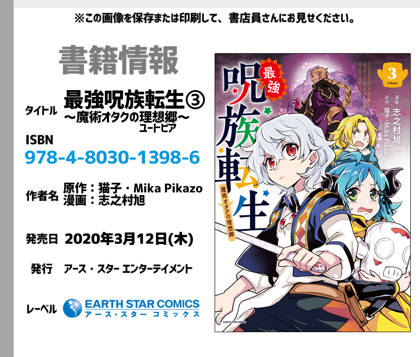 43 59 連載中の「最強呪族転生」コミカライズ3巻が今月12日に発売になります! 現在世間的には外出などが困難かと存じますが、ご都合の良い購入手段でよろしくお願いします!🙇♂️ 20/03/04 20:15