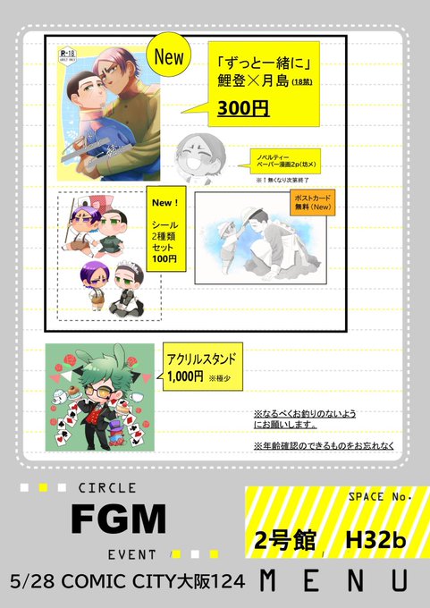 2 2 5/28インテ大阪 黄金暗号22 「お品書き」 うん年ぶりの遠征イベ参加なのでバタバタしてるかもしれないですがよろしくお願いします!!ノベルティは無くなり次第終了となります。新刊サンプルはリプ↓に。よろしくお願いします!! 23/05/21 21:08