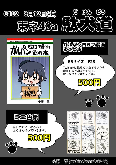 34 113 コミケ102 東ネ48aです! 『ガルパン四コマ漫画まとめ本』 『ミニ色紙』 よろしくお願い致します! 23/08/12 10:48