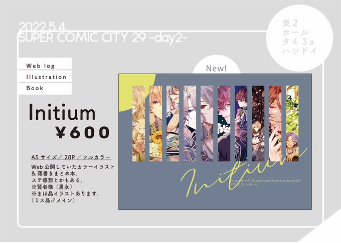 5/4 SSC29 賢者のマナスポット 【新刊】web logイラスト集【Initium】 A5/28P/¥600 ---------------- 魔法使いと賢者様のイラスト含めたフルカラーイラスト集です。 webであげてたもの中心に落書き数点入れた詰め合わせになります。 通販は近日中にBooth予定で公開予定です。 よろしくお願いします〜!