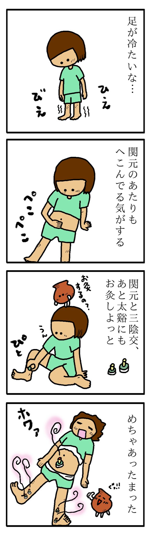 生理前にお灸していい感じだったツボ。 ・関元(かんげん) ・太谿(たいけい) ・三陰交(さんいんこう) #4コマ #イラスト #エッセイ漫画 #コミックエッセイ #4コマ漫画 #ゆるいイラスト