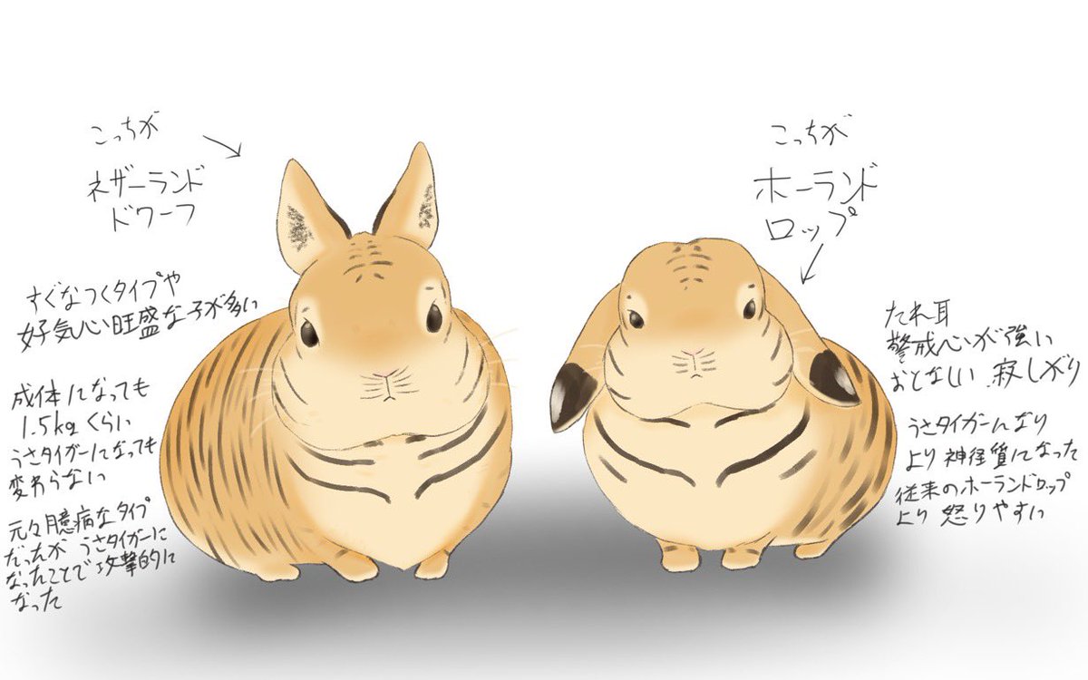 うさぎの日という事で改めてタグ参加します。 創田研究所では保護した飼いうさぎを元に改良動物を生み出して自然界に送り出すプロジェクトを行っています。 主に使われているのはドワーフとロップです。 #うさぎの日 #絵柄が好みって人にフォローされたい #絵描きさんと繋がりたい #イラスト